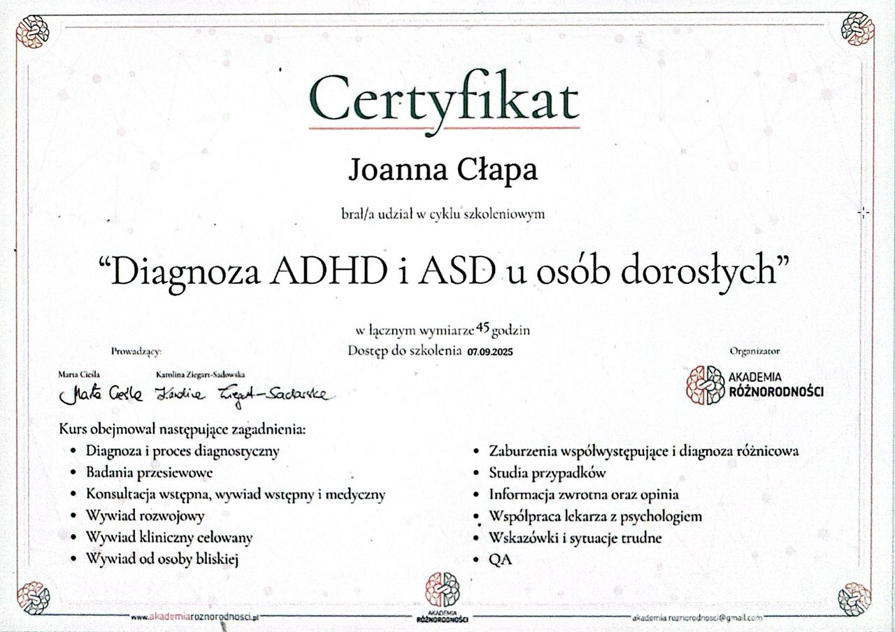 Jestem absolwentką psychologii na Uniwersytecie Gdańskim. Swoje doświadczenie zawodowe zdobywałam głównie w pracy klinicznej z dziećmi, młodzieżą,a obecnie pracuję z osobami dorosłymi. Swoją wiedzę aktualizuję i poszerzam na bieżąco głównie dzięki szkoleniom o bardzo różnej tematyce, jak i studiowaniu aktualnych badań naukowych. Jestem absolwentką studiów podyplomowych z psychotraumatologii na Uniwersytecie Gdańskim, w 2024r rozpoczęłam szkolenie w szkole psychoterapii w nurcie integratywnym. Zajmuję się diagnozą psychologiczną dorosłych, a moim głównym obszarem zainteresowań są zaburzenia o podłożu neurorozwojowym. Diagnozuję ADHD i ASD u dorosłych, prowadzę psychoedukację i terapię ADHD z osobami dorosłymi. Jestem osobą neuroatypową, a moją supermocą jest ADHD.